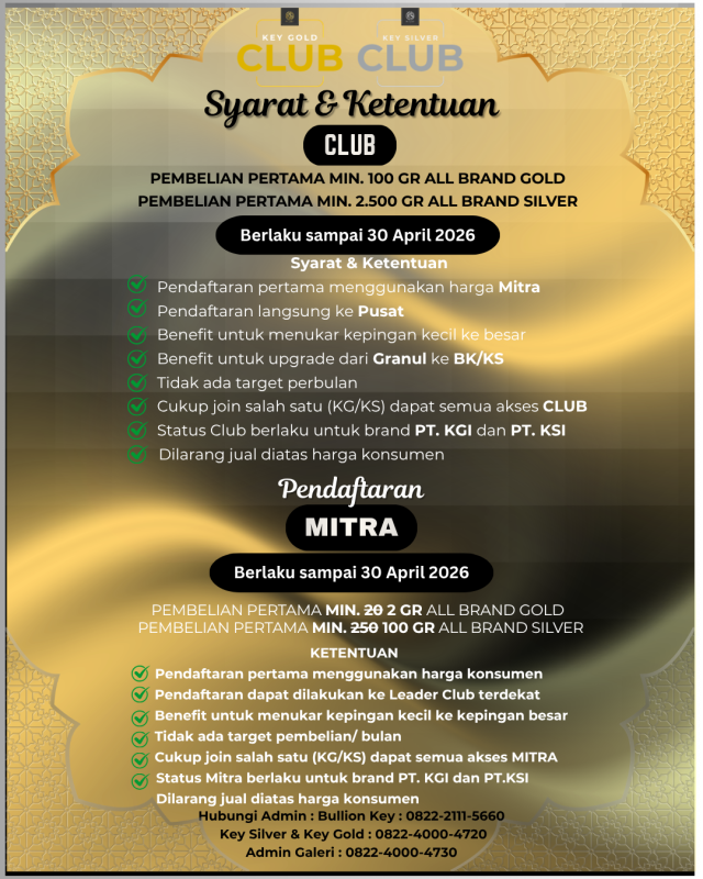 • Hanya dengan membeli Minimal 1,5 kg Key Silver/ 2,5 kg Bullion Key